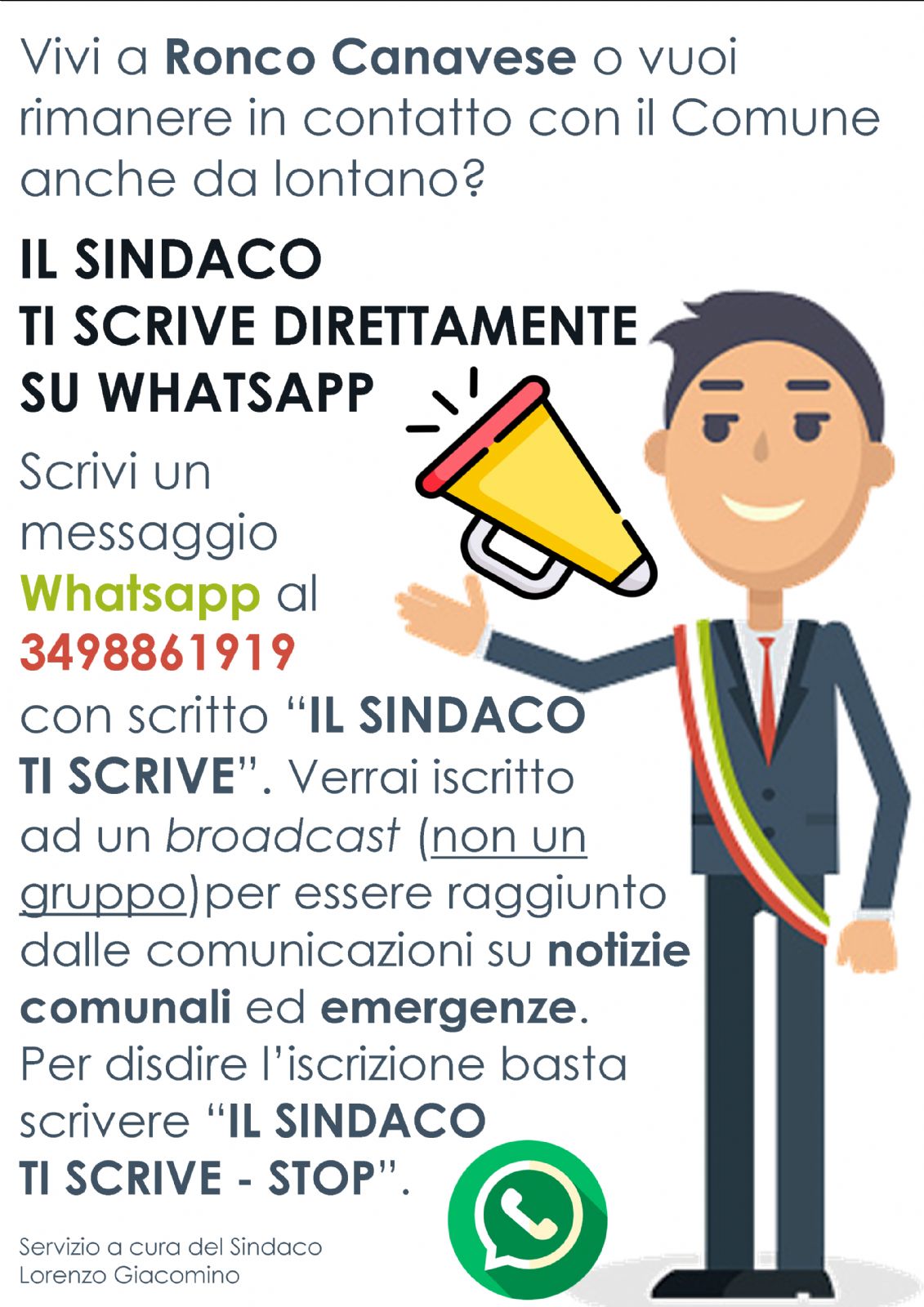 Scrivi un messaggio Whatsapp al 3498861919 con scritto “IL SINDACO TI SCRIVE”. Verrai iscritto ad un broadcast (non un gruppo) per essere raggiunto dalle comunicazioni su notizie comunali ed emergenze. Per disdire l’iscrizione basta scrivere “IL SINDACO TI SCRIVE - STOP”.