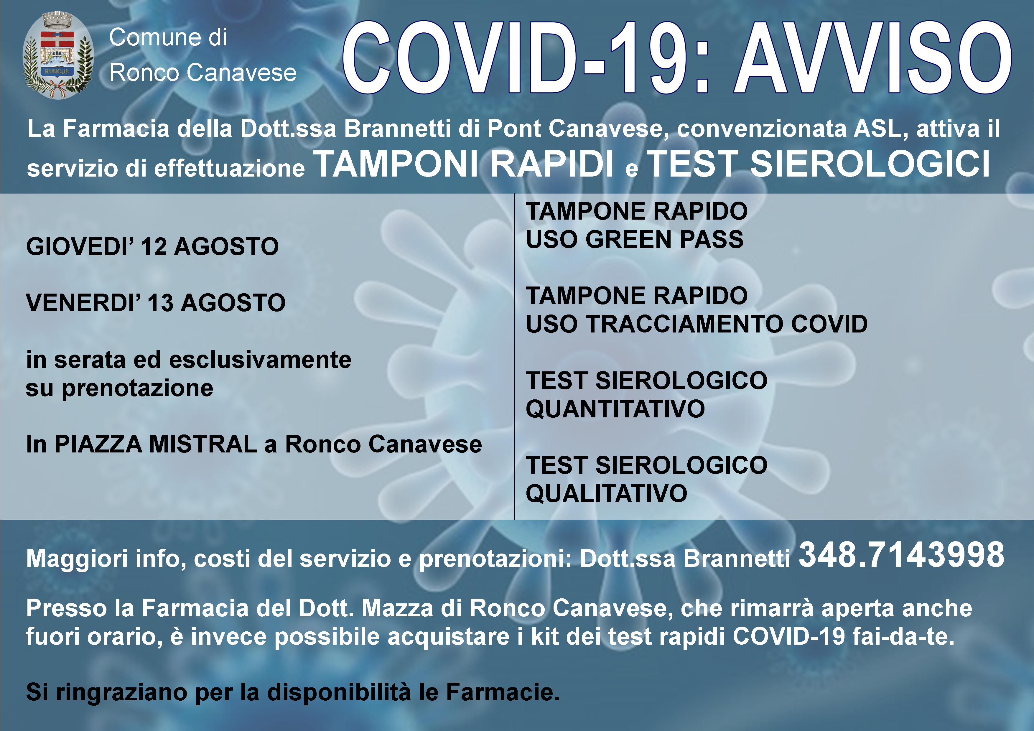 Servizio di effettuazione TAMPONI RAPIDI e TEST SIEROLOGICI in Ronco Canavese nelle serate di GIOVEDI 12 e 13 AGOSTO in PIAZZA MISTRAL (SU PRENOTAZIONE)