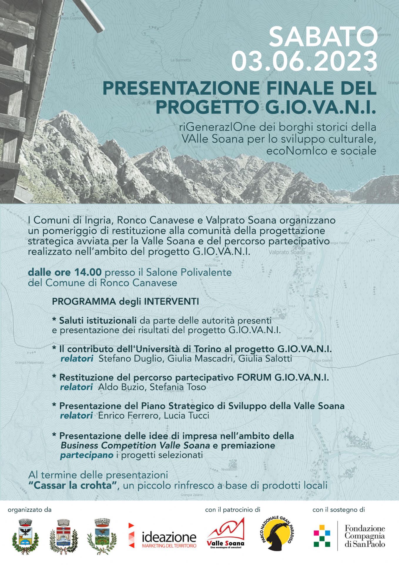 I Comuni di Ingria, Ronco Canavese e Valprato Soana organizzano un pomeriggio di restituzione alla comunità della progettazione strategica avviata per la Valle Soana e del percorso partecipativo realizzato nell’ambito del progetto G.IO.VA.N.I. - riGenerazIOne dei borghi storici della VAlle Soana per lo sviluppo culturale, ecoNomIco e sociale.