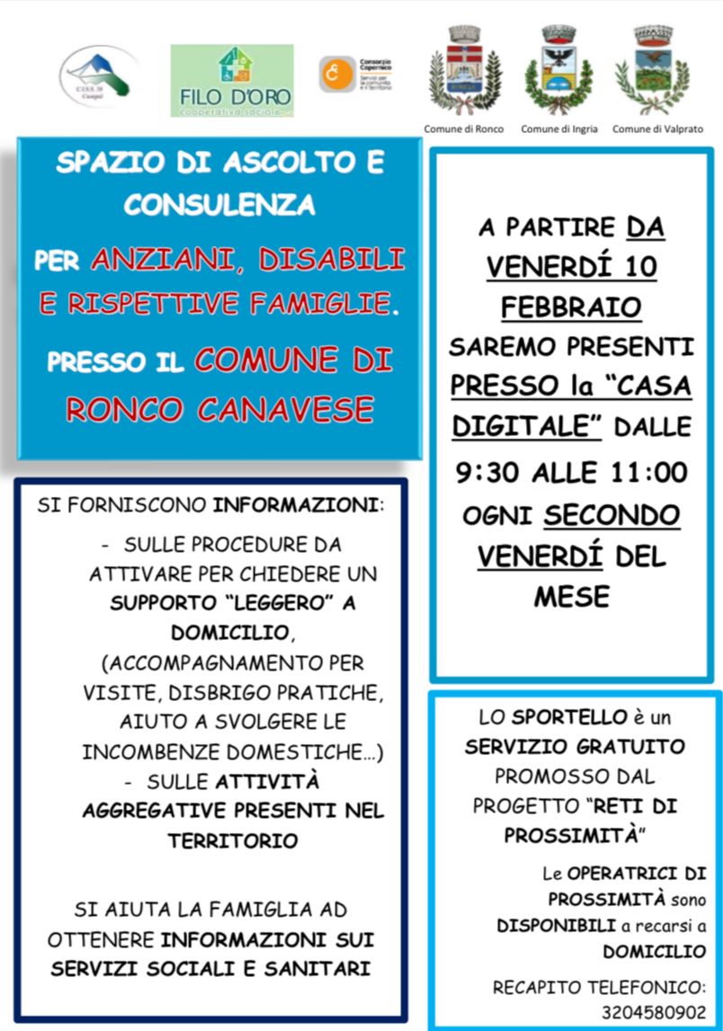 A partire da venerdì 10 febbraio le operatrici saranno presenti presso la CASA DIGITALE (ambulatorio medico) di Ronco C.se dalle 9.30 alle 11.00 ogni secondo venerdì del mese.